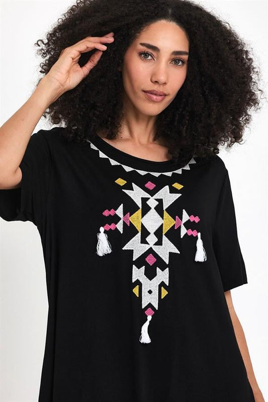 Siyah Kayık Yaka Nakışlı Püsküllü Cepli Penye Midi Elbise