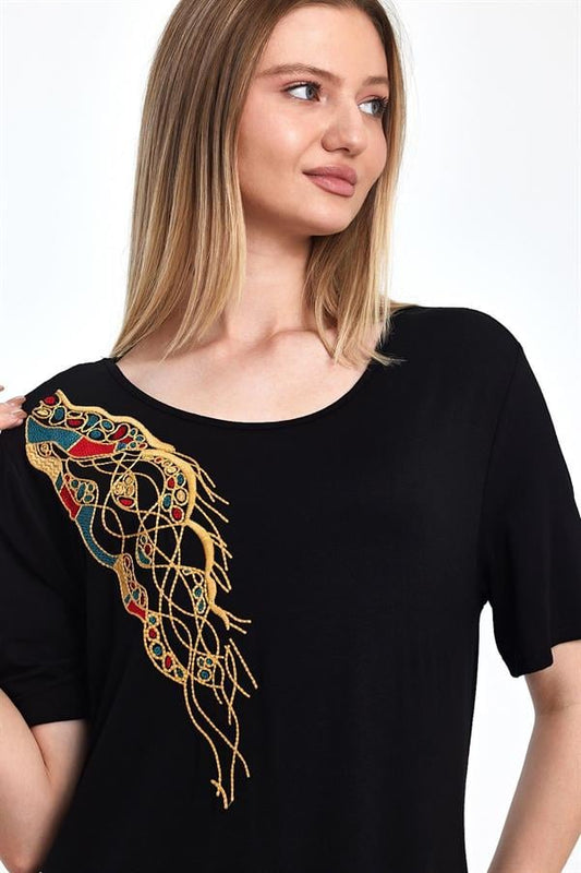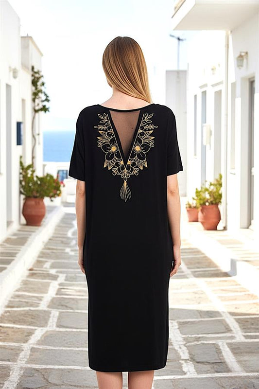 Siyah Kısa Kollu Yakası Gold Nakışlı Cepli Midi Penye Elbise