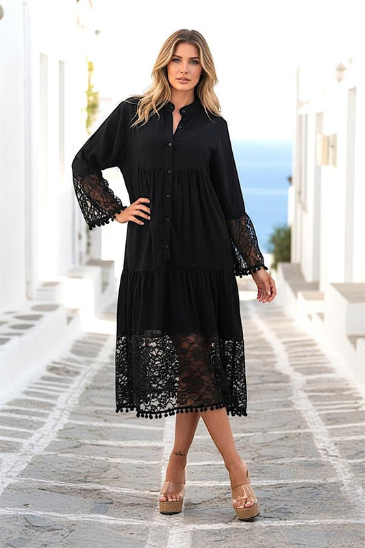 Siyah Önden Düğmeli Kolları Ve Eteği Dantelli Ponponlu Midi Elbise