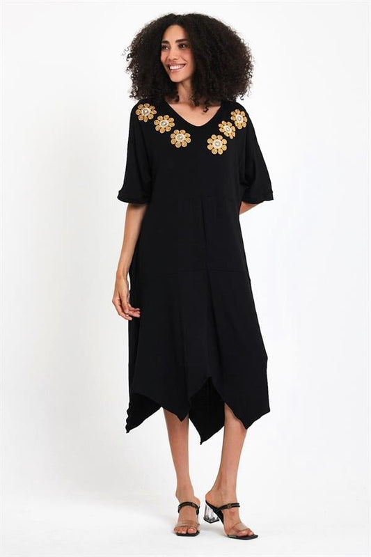 Siyah V Yaka Kısa Kollu Yakası Çiçek Nakışlı Cepli Asimetrik Midi Penye Elbise