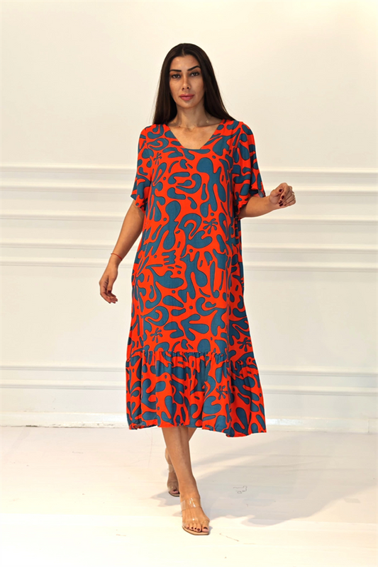 Turuncu Desenli V Yaka Cepli Etekleri Fırıfırlı Midi Elbise