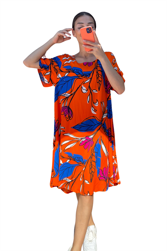 Turuncu Desenli Yuvarlak Yaka Kısa Kollu Midi Elbise