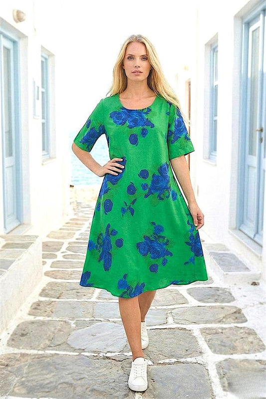 Yeşil Çiçekli Yuvarlak Yaka Kısa Kollu Midi Elbise