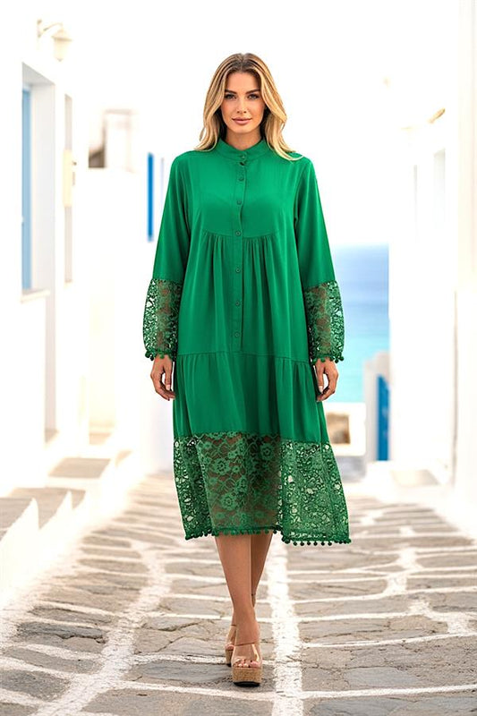 Yeşil Önden Düğmeli Kolları Ve Eteği Dantelli Ponponlu Midi Elbise