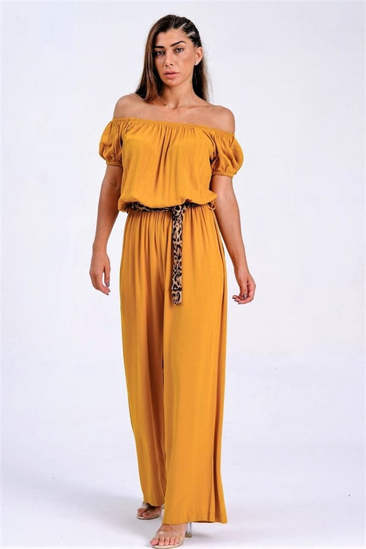 Hardal Carmen Yaka Leopar Kemerli Beli Lastikli Dokuma Tulum