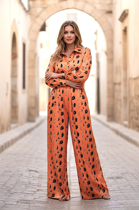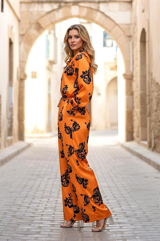 Turuncu Desenli Gömlek Yaka Düğmeli Kemerli Bol Paça Saten Tulum