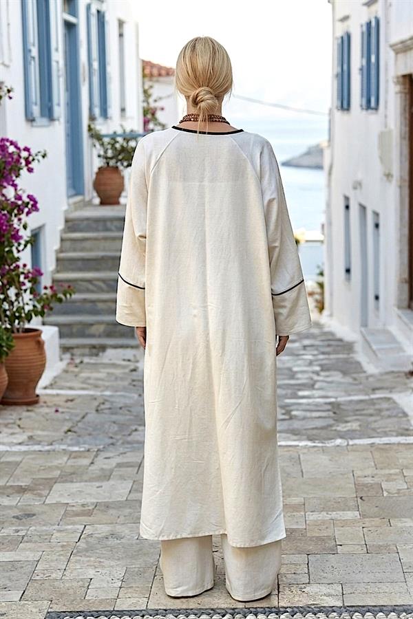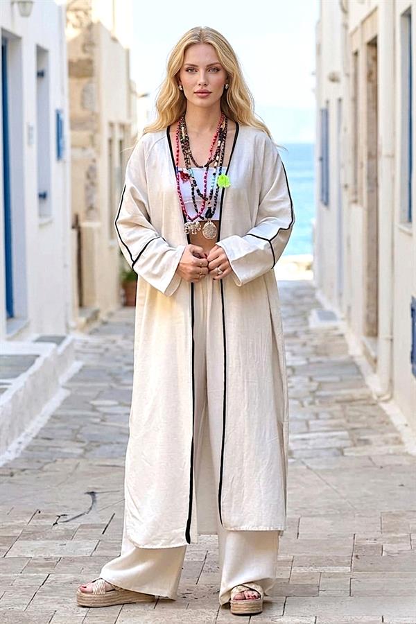 Bej Siyah Bordürlü Keten Kimono Pantolon Takım