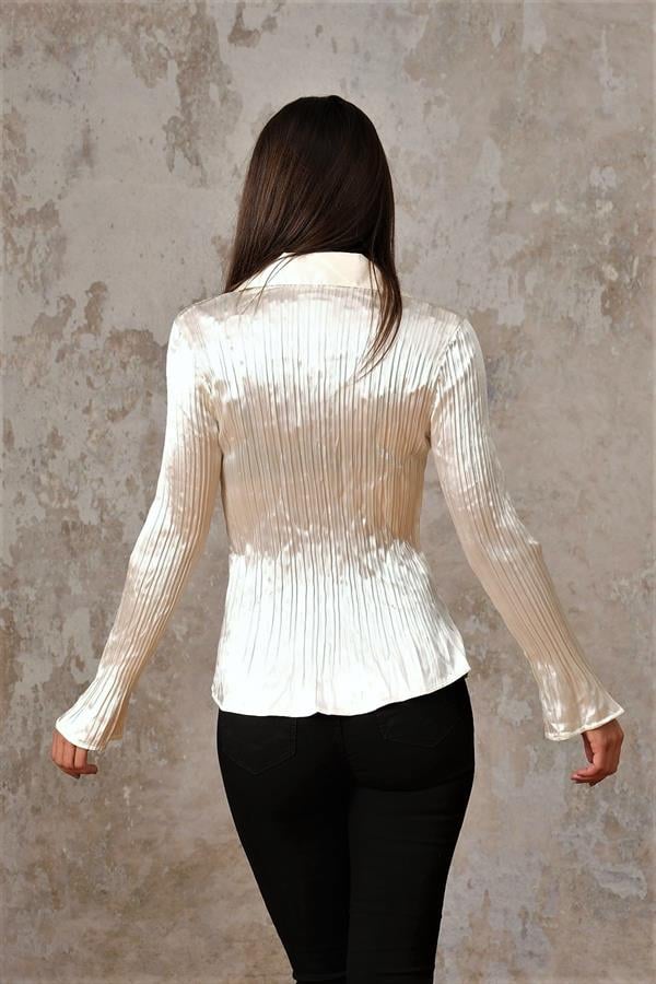 Ekru Saten Piliseli Uzun Kollu Gömlek