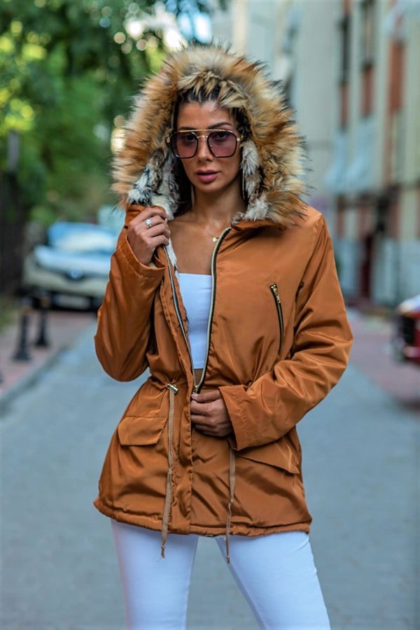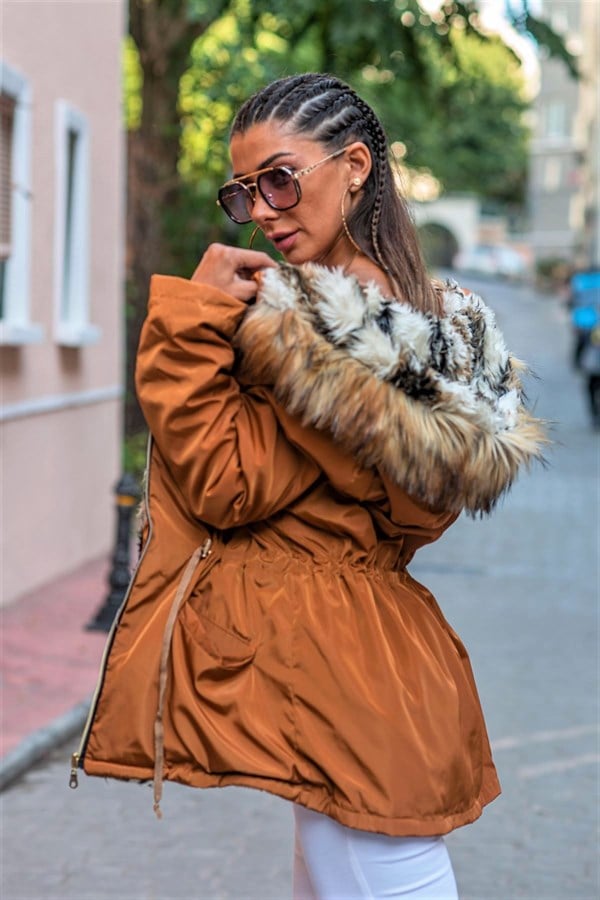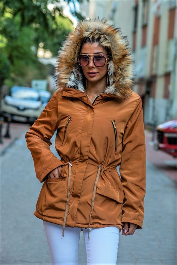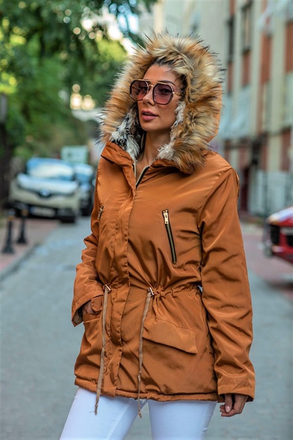 Kahverengi Kürk Kapüşonlu İçi Kürklü Beli Büzgülü Su Geçirmez Mont