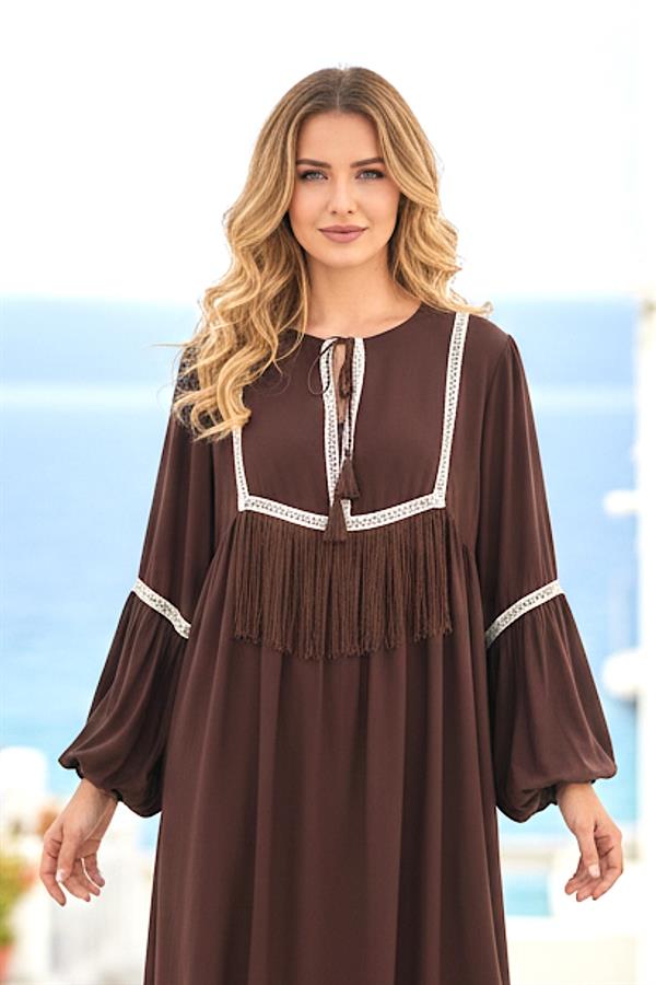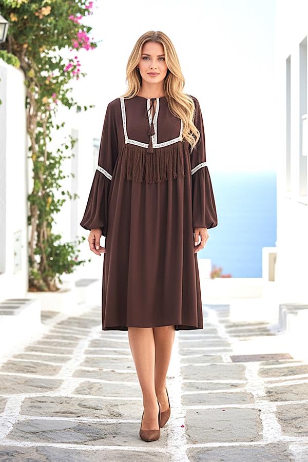 Kahverengi Püskül Detaylı Diz Boyu Elbise