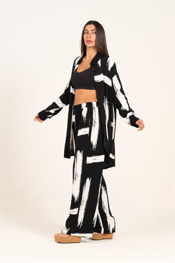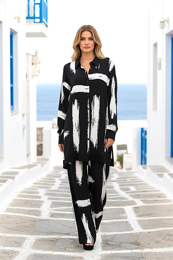 Siyah Beyaz Desenli Kolu Apoletli Cepli Gömlek Pantolon Takım